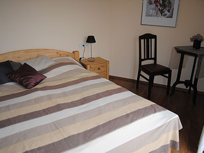 Das Schlafzimmer mit Doppelbett, ist im modernen Stil eingerichtet. |